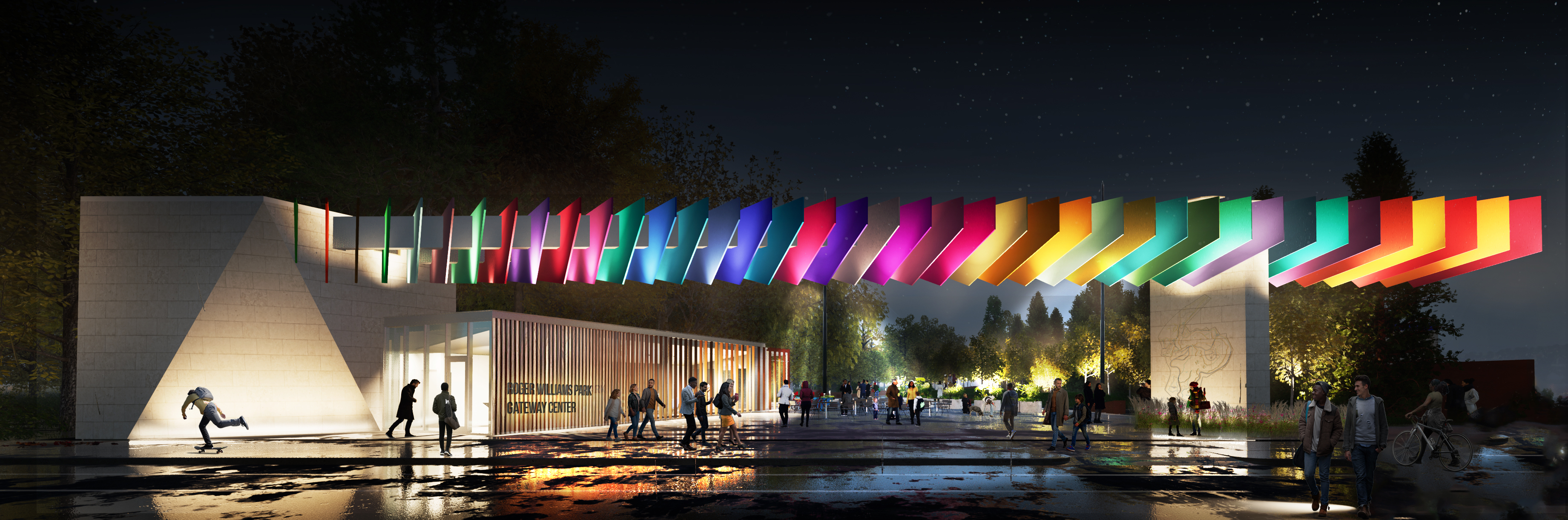 PROVIDENCE – Spanning high above the entrance to the park, a long set of bright, multicolored fins is meant to represent the diversity and vibrancy of small businesses lining Broad Street in South Providence, as part of the Roger Williams Park Gateway project that aims to turn what was once a blighted lot into a welcoming destination.