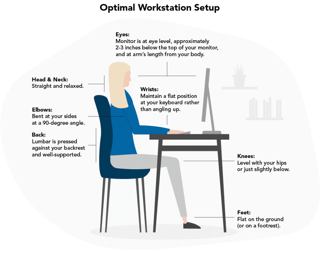 If you’re currently working from the couch or dining room table of your home, you’re probably not getting the appropriate support for a good postural position. And if you do have a dedicated setup at home or in the office, you could still be putting pressure on your back and neck with a structure that isn’t suited to your body. To relieve strain and prevent injury, use this head-to-toe reference when considering your body placement at your desk area and overall workstation setup:
