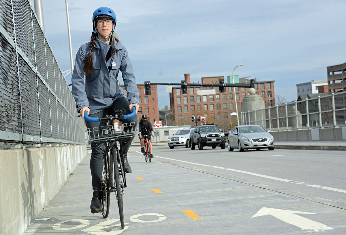 Liza Burkin, organizer for the Providence Streets Coalition, makes use of new bike lanes on the Clifford Street bridge over Interstate 95. Burkin has been a leading advocate for the city’s bike infrastructure. PBN PHOTO/