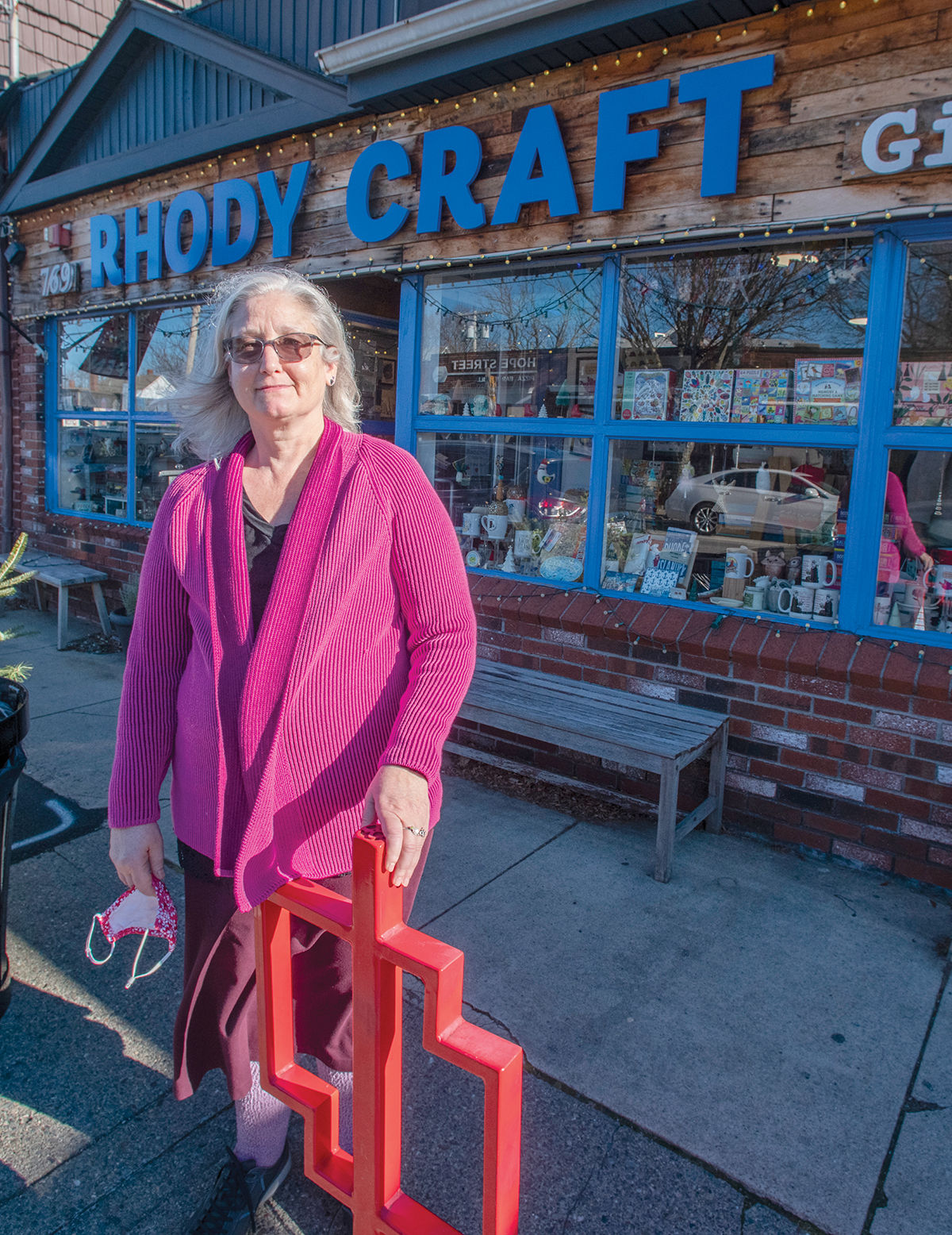 NOT IN FAVOR: Kim Clark, owner of the Rhody Craft LLC gift store on Hope Street in Providence, is opposed to a planned two-way bike lane replacing one side of street parking and fears that increased traffic, congestion and parking woes will hurt her business. / PBN PHOTO/MICHAEL SALERNO[/caption]