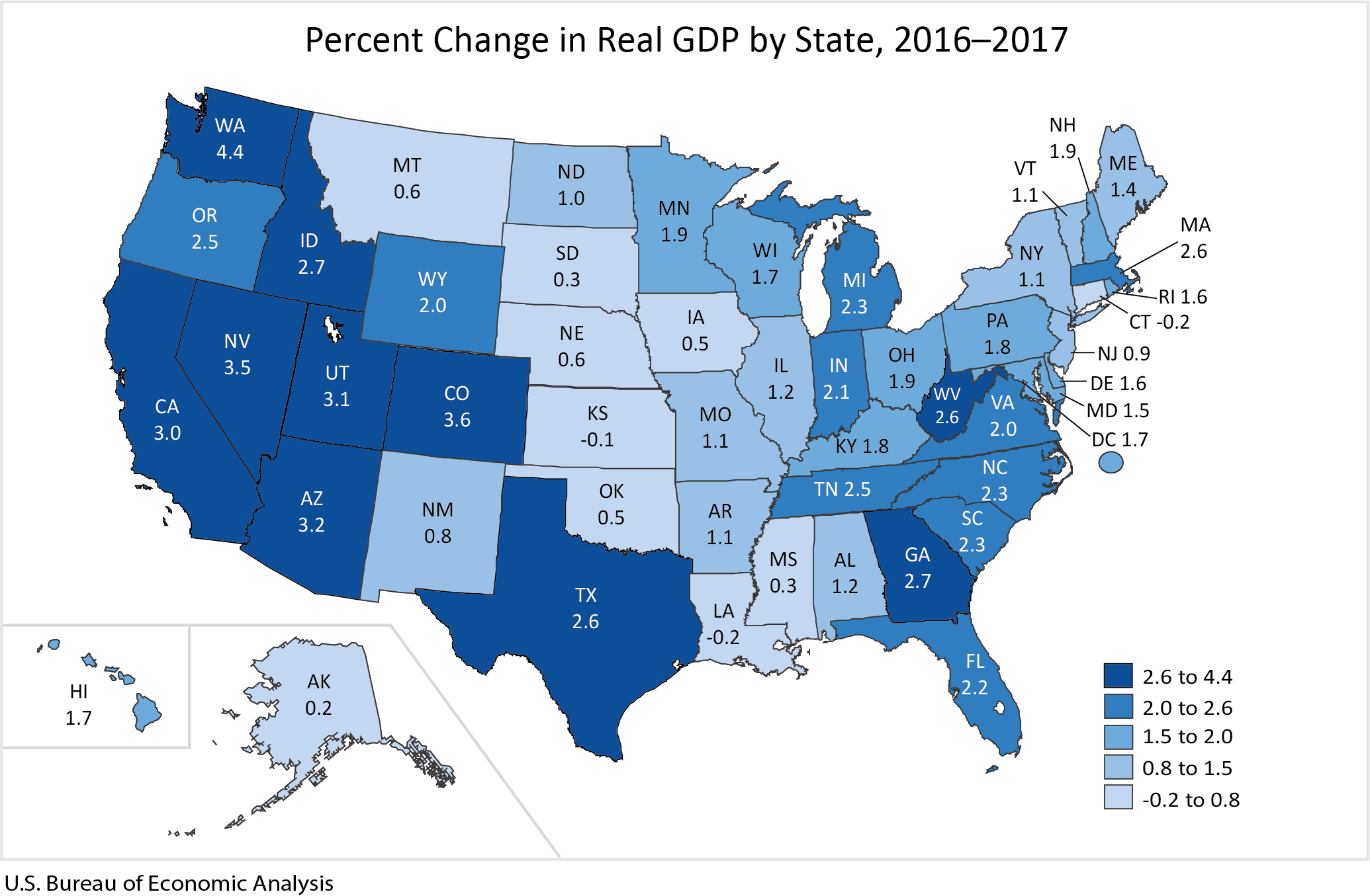 The BEA said that Rhode Island had the No. 29 largest real GDP growth rate in the nation in 2017. Washington was No. 1 for real GDP growth rate at 4.4 percent, while Louisiana ranked last with a 0.2 percent decline.