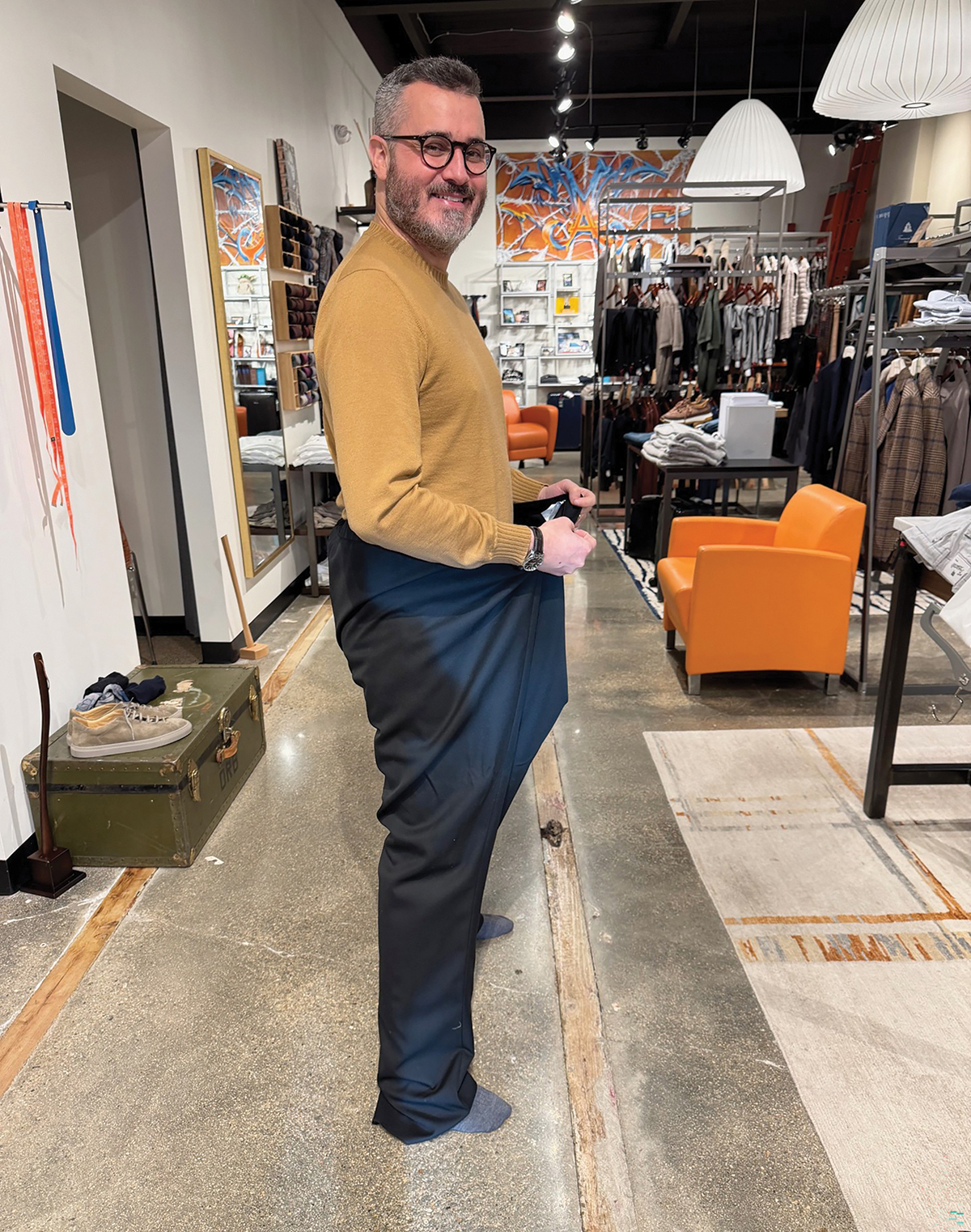 BIG DIFFERENCE: Colin Ward, Marc Allen Fine Clothiers store manager, displays how, without tailoring, his pants are ill fitting after weight loss.