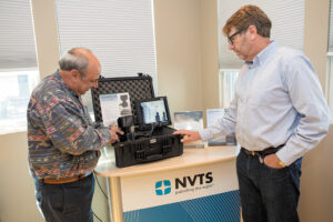 VEHICLE CAMERA: Mike Santolupo, left, chief engineer for Night Vision Technology Solutions in Jamestown, and company owner Joe Janson test the NVTS thermal camera driver-vision system for armored and track-wheel vehicles.