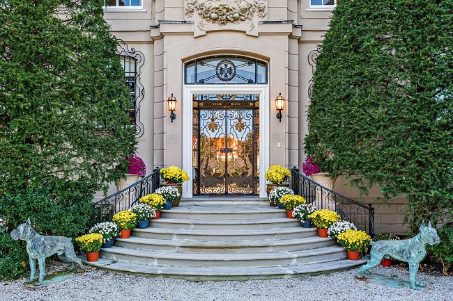 Built in 1927 and known as “Bois Doré,” which translates as “Golden Wood,” the 115 Narragansett Ave. home in Newport is designed in a “Louis XVI palatial fashion,” with a marble foyer entrance, a limestone façade and an 85-foot “great hall” that gives the home “a sense of balance and grandeur,” according to the real estate agency. The front steps are flanked by two dog statues.