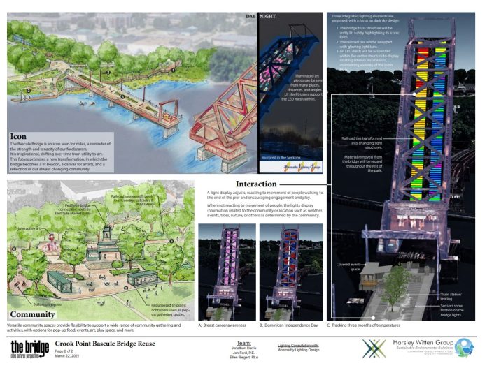 In 2021, the city held a design competition for the Crook Point bridge, which drew more than 80 proposals. The winning design called for the bridge to be converted into a pier accessible to the public but disconnected from the upright portion of the bridge. That raised portion would be adorned with multicolored LED lights. But those plans were never acted upon.