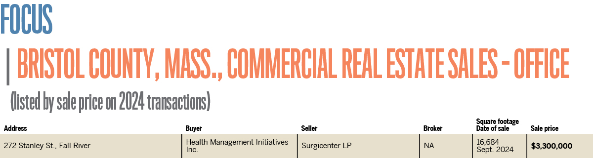 Sales ranked by square footage: 1. 272 Stanley St., Fall River | Square footage: 16,684 2. 1617-1625 Pleasant St., Fall River | Square footage: 8,198 3. 481 Old Post Road, North Attleborough | Square footage: 5,744 SUBSCRIBERS: Click here to view the complete list. For information about participating in PBN’s Top Lists, or to make additions or corrections,