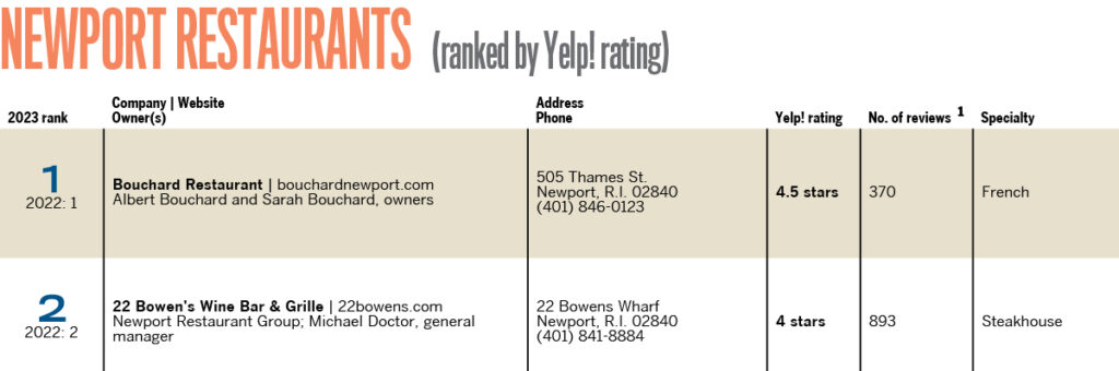 Ranked by number of reviews: 1. The Mooring Seafood Kitchen & Bar | No. of reviews: 2,217 2. Midtown Oyster Bar | No. of reviews: 1,419 3. 22 Bowen’s Wine Bar & Grille | No. of reviews: 893 The complete list is available for purchase online. For information about participating in PBN’s Top Lists, or to make additions