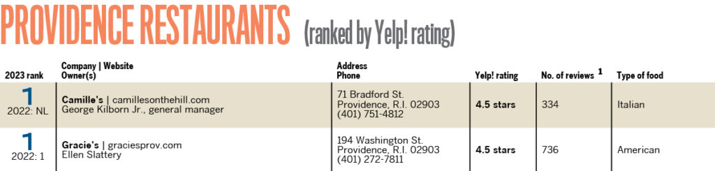 Ranked by number of reviews: 1. Hemenway’s Seafood Grill & Oyster Bar | No. of reviews: 926 2. Gracie’s | No. of reviews: 736 3. Al Forno Restaurant | No. of reviews: 6462 The complete list is available for purchase online. For information about participating in PBN’s Top Lists, or to make additions or corrections, call (401) 680-4838