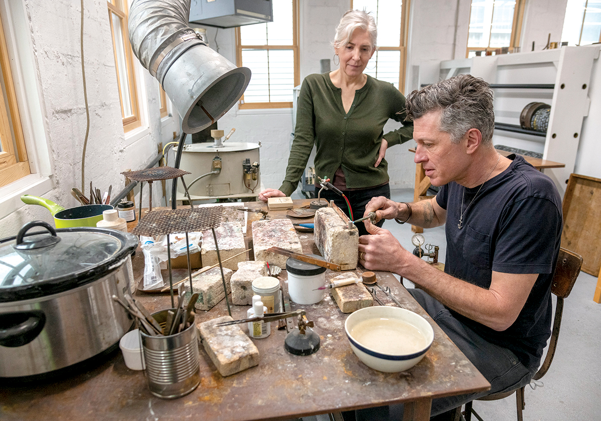 In Sandi Bonazoli and Jim Dowd’s Warren metalsmithing studio, Beehive Handmade, equipment ranges from a 100-year-old machine to modern technology such as a laser engraver and 3D printer.