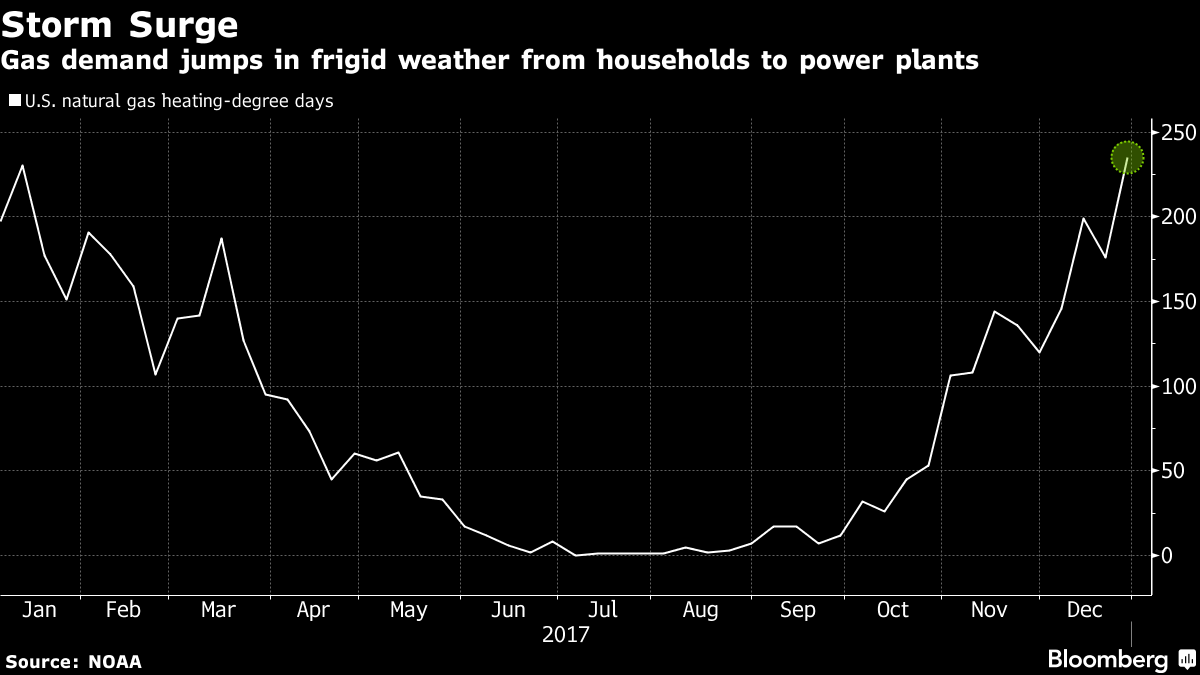 The market mayhem in and around New York is having a knock-on effect even in regions far away from stormy weather. At an Appalachian pipeline hub known as Dominion South that is typically home to the cheapest American gas, the price jumped to $4.15, almost twice the 12-month average and a huge premium to late October, when it fetched just 29 cents, according to Borruso and Intercontinental Exchange data.