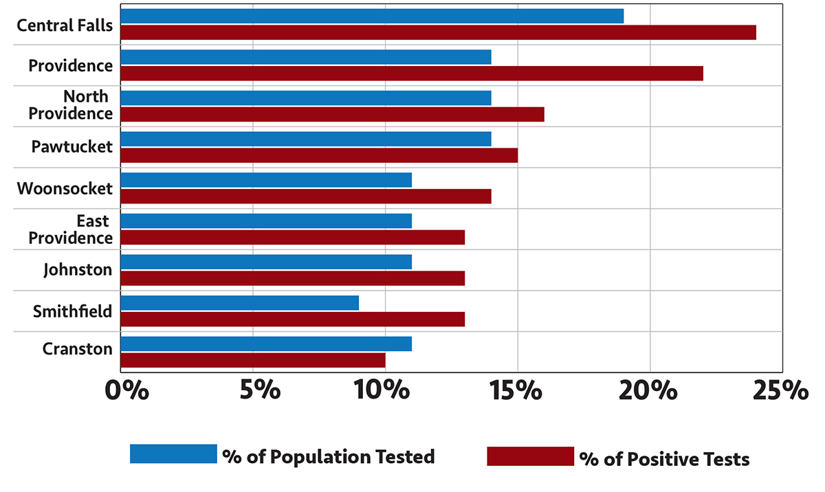 R.I. Department of Health data has shown that Central Falls, Providence and Pawtucket have the highest numbers of people testing positive, and the greatest infection rates per capita.