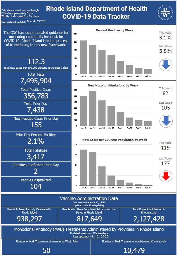By comparison, there were 417 new cases identified on March 3, 2021. The transmission rate on March 3, 2021, was 239.2 cases per 100,000 persons.