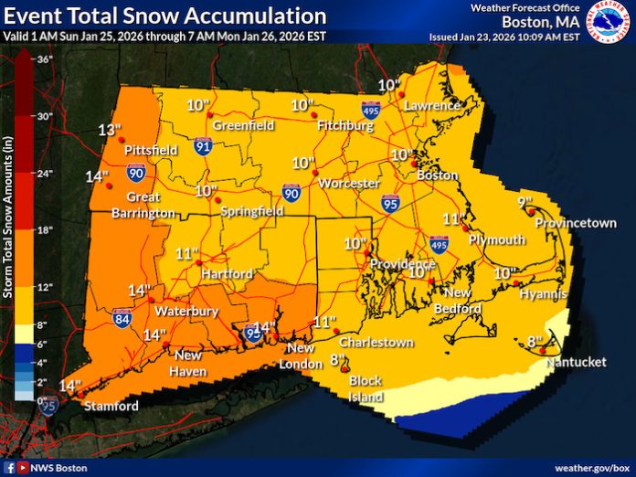 Widespread snow will engulf Rhode Island and southeastern Massachusetts on Jan. 25, with 12 to 17 inches expected across most areas, according to the National Weather Service. Less is expected along the coastline areas due to a mix of sleet with the snow.