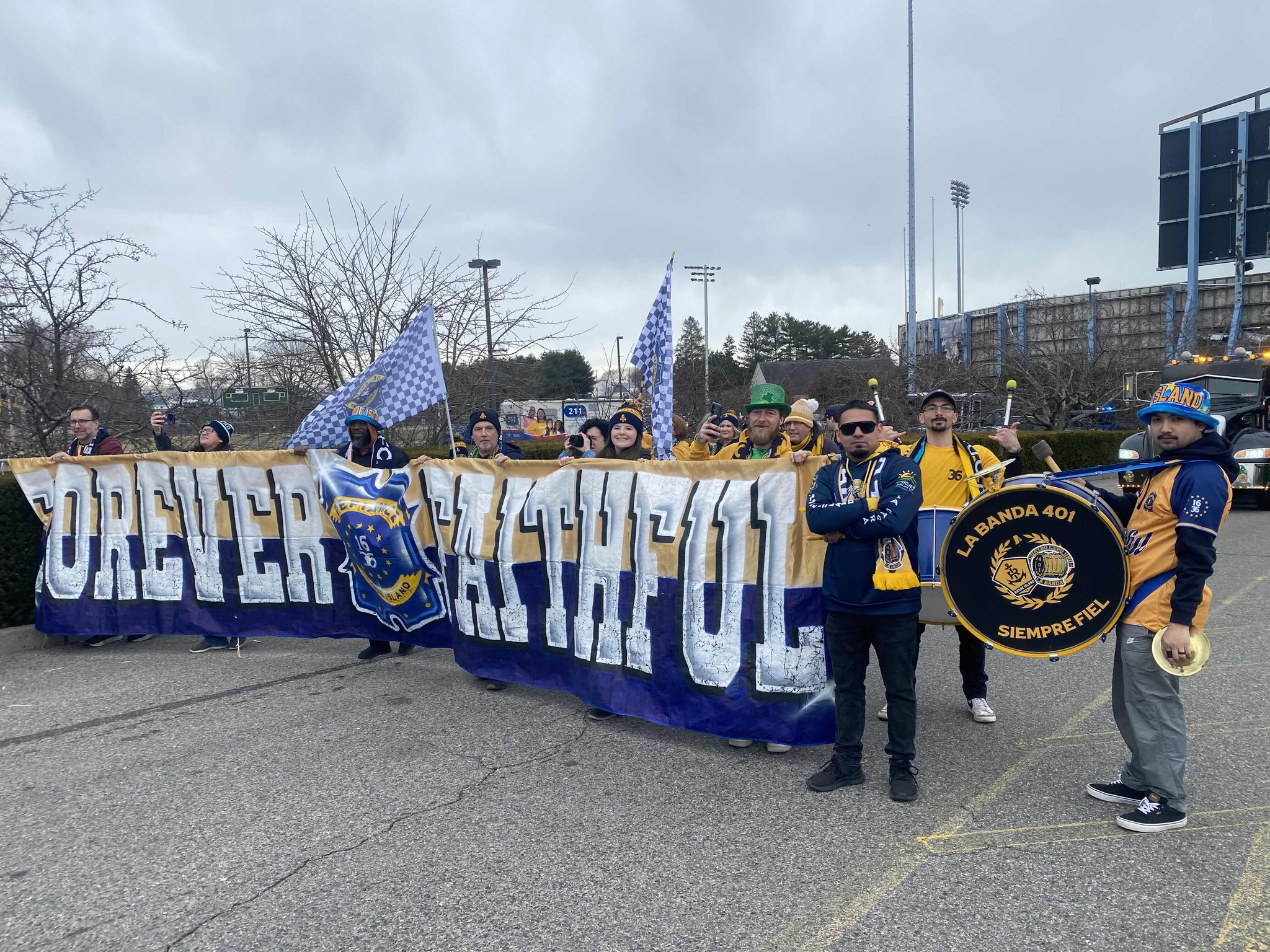DEFIANCE 1636, the supporters group for Rhode Island FC, also includes “La Banda 401,” members who play drums and horns throughout every home match. / COURTESY DEFIANCE 1636[/caption]