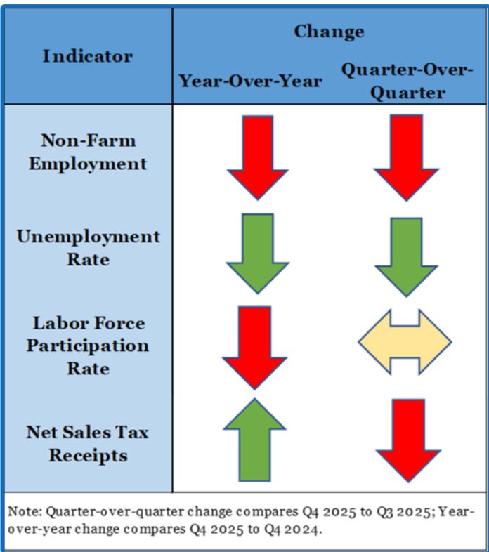 But nonfarm employment – which includes the trade, transportation, utilities and business services sectors – lost 600 jobs from the previous quarter and has dropped 1,600 jobs from a record high set during the first three months of 2025.