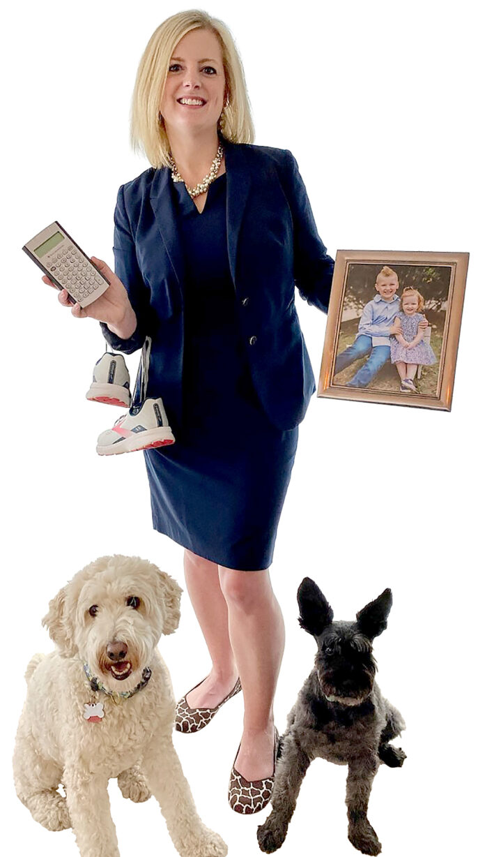 THE PROP: Shelly Orsi’s items are a mix of work and pleasure. She holds a calculator representing her work with Bank of America Corp., running shoes and a picture of her children, while posing with her two dogs.