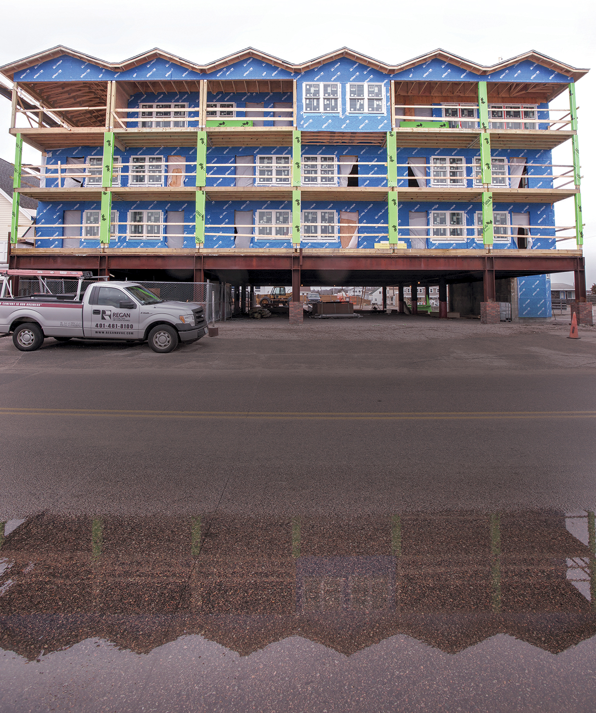 STEADFAST: The Hotel Maria under construction in Westerly. Owner John Bellone used to have a restaurant in the area, but it was destroyed by the remnants of Hurricane Sandy in 2012. Rather than move away, as many homeowners and businesses did after the storm, Bellone decided to stay and rebuild, this time much higher. / PBN PHOTO/BRIAN MCDONALD[/caption]