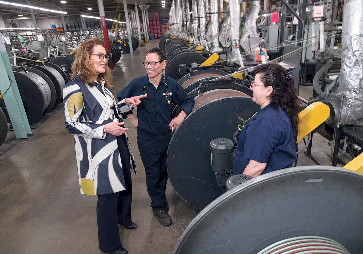 RISE UP: Hope Global in Cumberland was flooded once in 2005 and again during the March 2010 floods. The company has spent upward of $1 million since on flood mitigation. Chief of Staff Leslie Taito, left, with maintenance workers Hector Valentin and Maria Fulns. All the motors of these wire knitter machines were raised about 3 feet. Fulns is standing next to the motor. / PBN PHOTO/MICHAEL SALERNO[/caption]