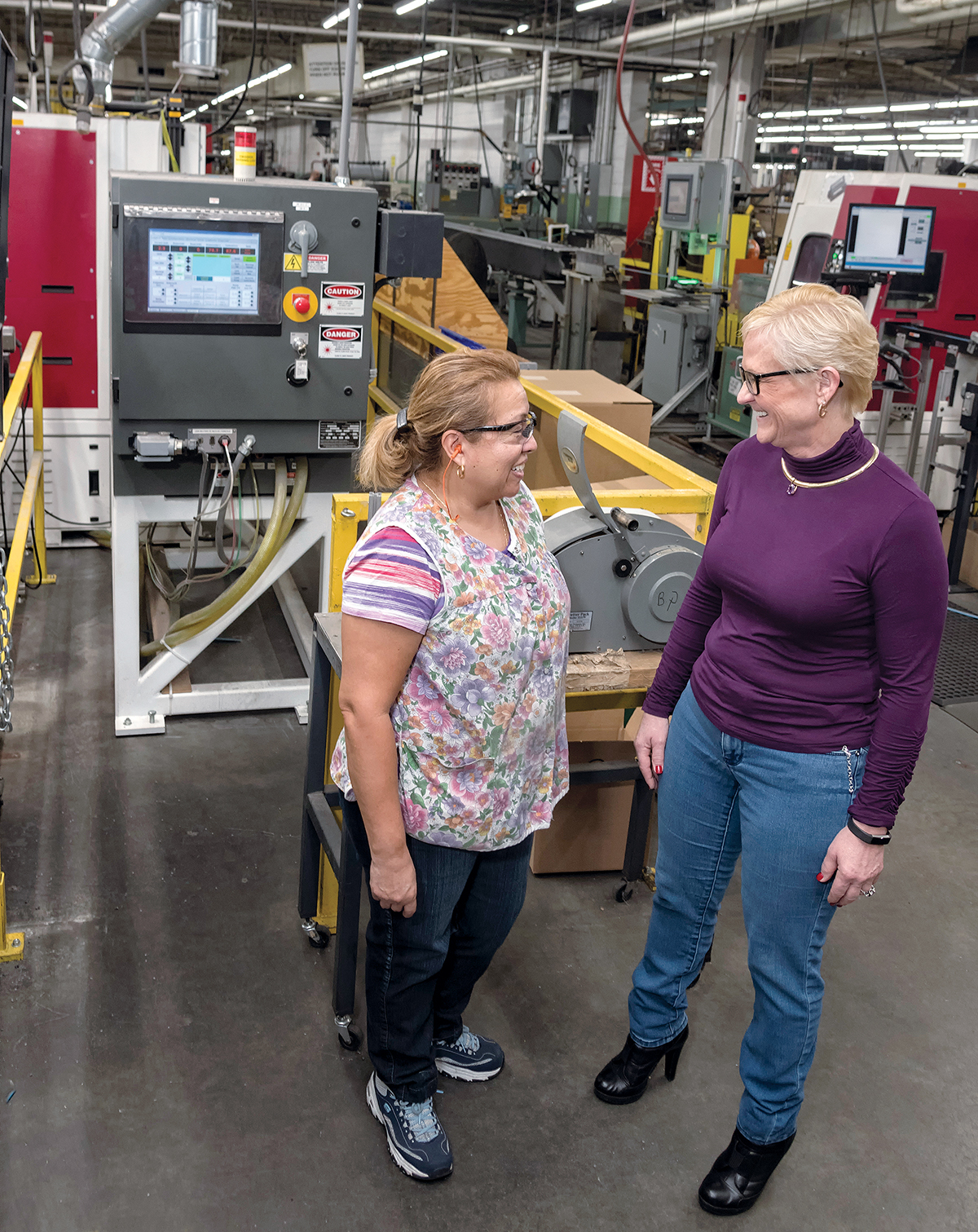 MITIGATION EFFORTS: Hope Global CEO Cheryl Merchant, right, speaks with Maria Paz, machine operator. The international manufacturer based in Cumberland was awarded a $1.5 million Community Development Block Grant for disaster relief after sustaining millions of dollars in flood damage in 2005 and 2010. / PBN PHOTO/MICHAEL SALERNO[/caption]