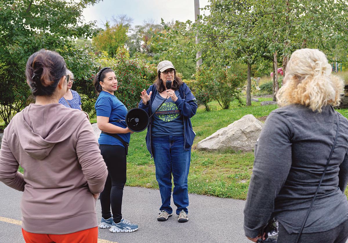 WALK AND TALK: Alicia J. Lehrer, center right, executive director of the Woonasquatucket River Watershed Council, speaks during a walk along the river in Providence. To her left is Maria Jose Gutierrez, community action co-facilitator. \ PBN PHOTO/MICHAEL SALERNO[/caption]