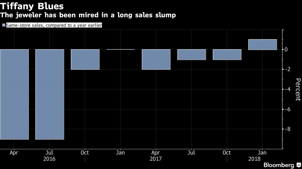 The key metric of same-store sales at the 181-year-old jeweler missed analysts’ estimates in most of its regions last quarter, driving the stock down Friday the most in almost 10 months. Tiffany has been trying to reverse a lengthy sales slump.