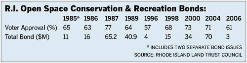 “Even at a time when our state is strapped for cash, it makes sense to save farmland from development,” said Rep. Donna M. Walsh (D-Charlestown), who pushed the act through along with Sen. V. Susan Sosnowski (D-South Kingstown). A separate attempt by Rep. John J. Loughlin II (R-Tiverton) to boost the bond’s total to $5 million was defeated by just six votes.