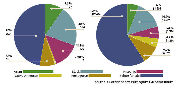FAIR SHARE?: The chart on the left breaks down the number and percentage of minority-owned and women-owned businesses certified to participate in Rhode Island’s Minority Business Enterprise program. The chart on the right